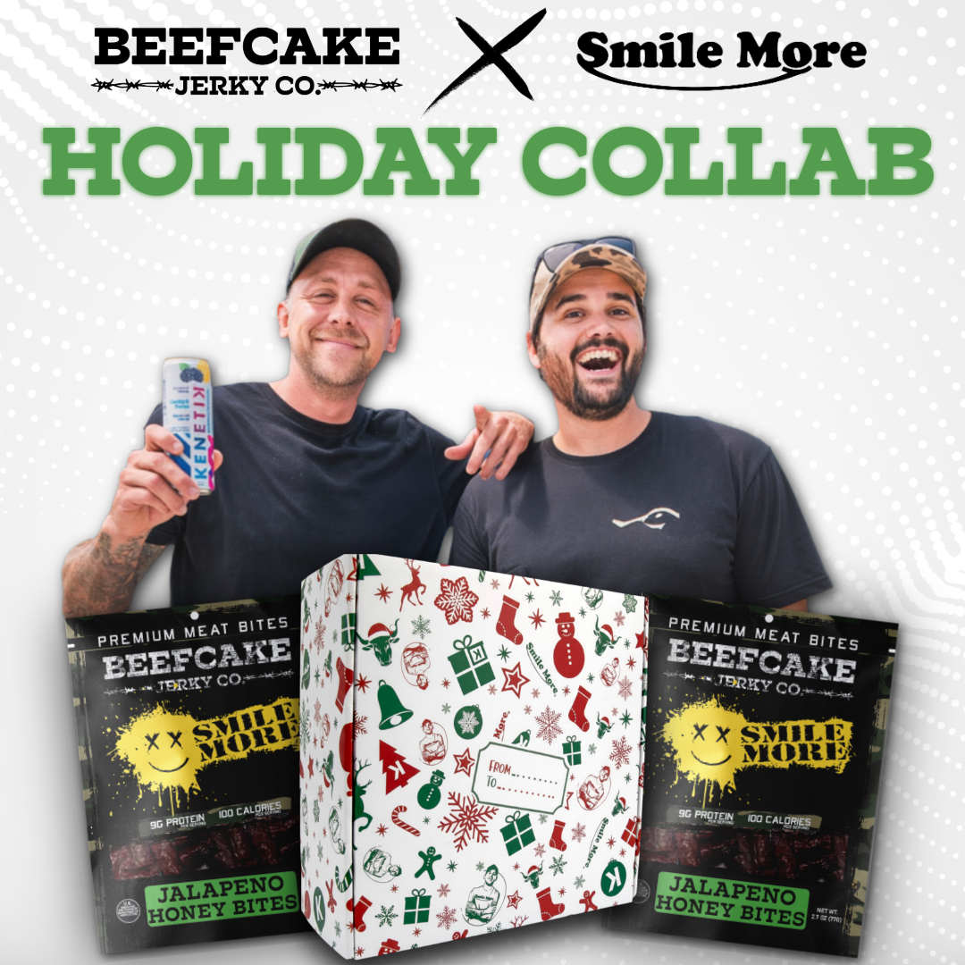 The NEW Roman Atwood Holiday Collab Crate come packed with limited edition products! This bundle includes (2) Smile More Jalapeño Honey Bites, (1) Cleetus Edition Kenetik, (1) Kenetik Performance Shot, (1) Smile More Can Koozie, (1) Smile More mug, (1) Beef Peppered, (1) Pork Teriyaki, (1) Pork Sweet Heat