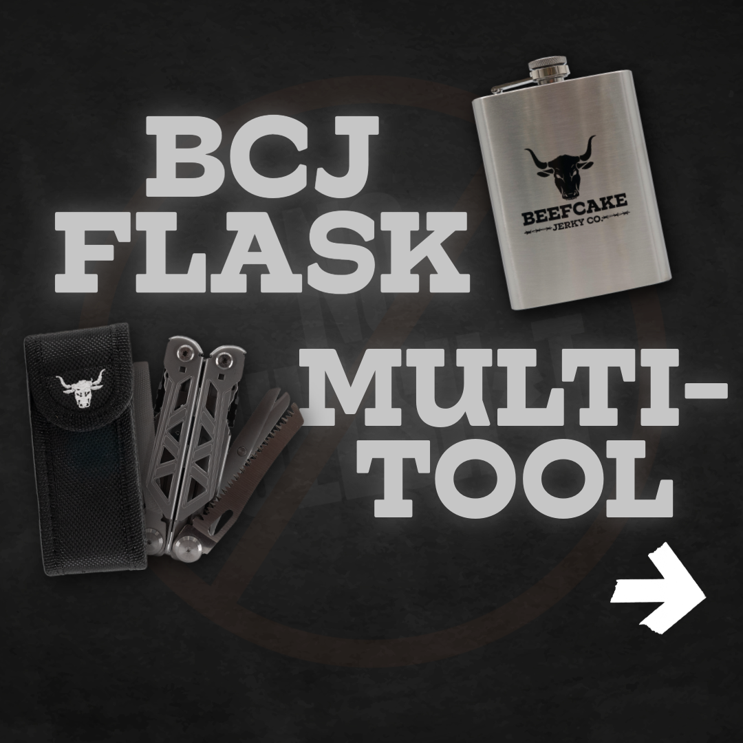 The No BS XMAS Crate is the ultimate bundle for the hard worker, featuring our heavy duty beefcake hoodie, a flask, a beefcake multitool and loaded with jerky including the all new BeefCake Jalapeno Cheese Summer Sausage!